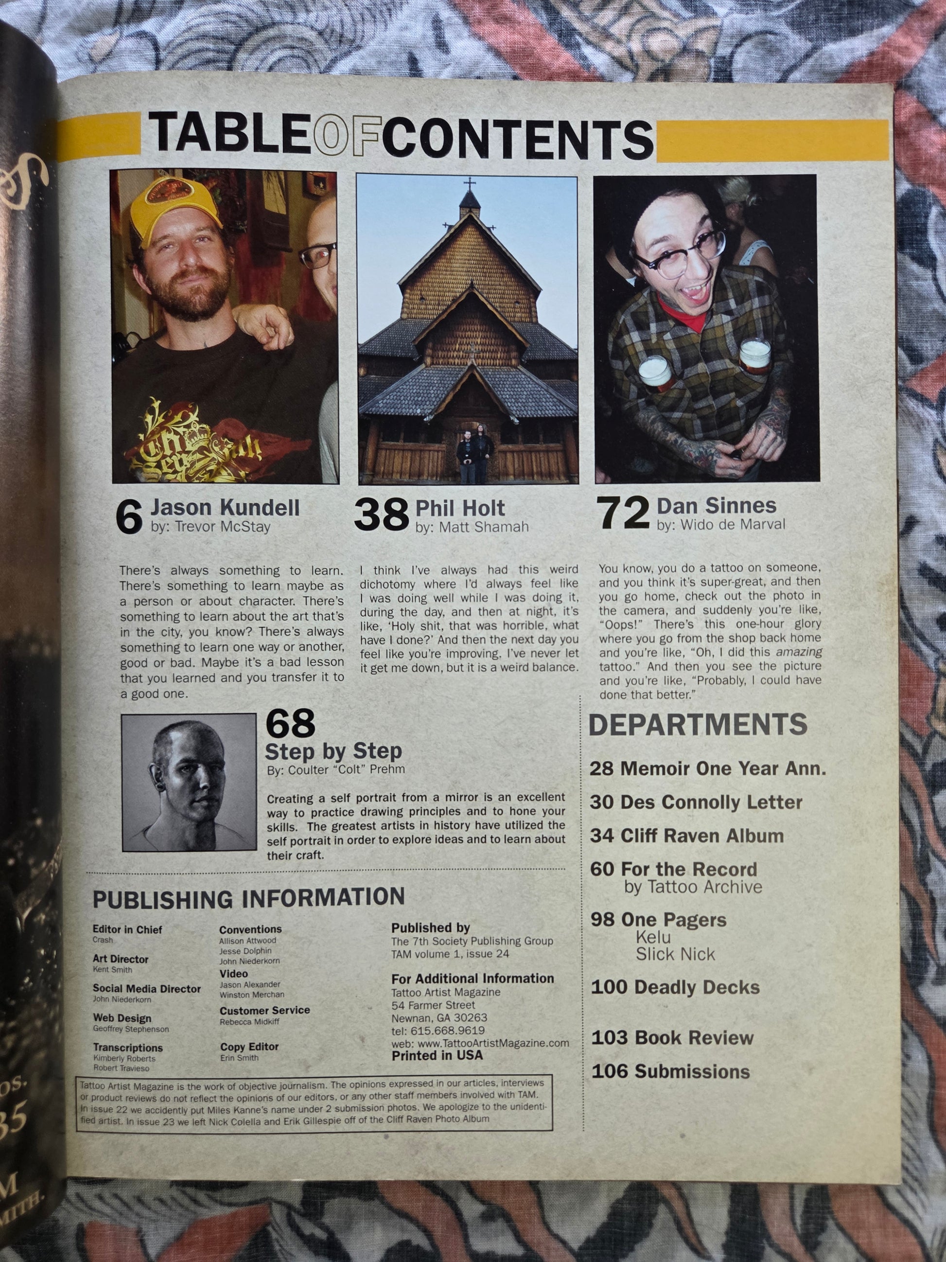 Tattoo Artist Magazine was a long-running magazine for tattooers by tattooers. Unlike most magazines that appeared in your local newsstands, this one publication was meant only for tattooers. Issue 24 features a photo gallery of Cliff Raven's photos (which include Sailor Jerry tattoo backpieces), Jason Kundell, Phil Holt, Dan Sinnes, and regular columns like reader submissions.