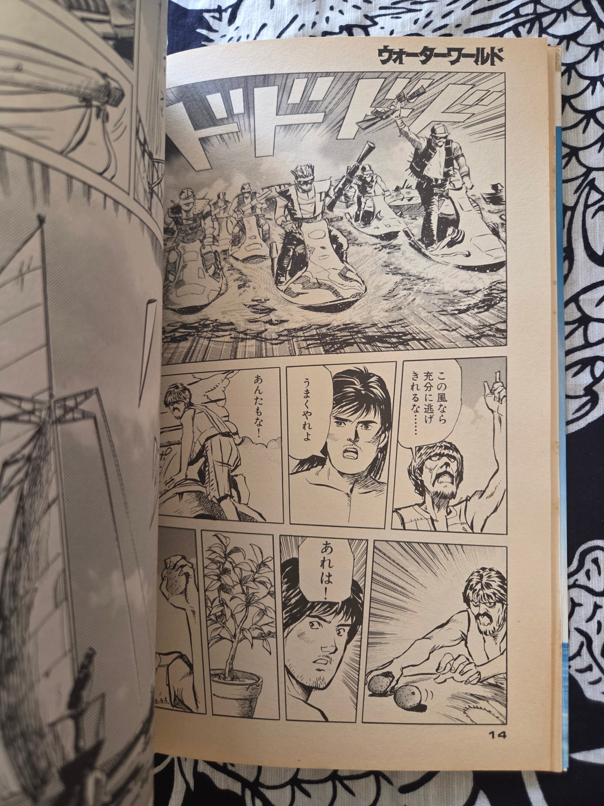 Most known for his Battle Slave Luza and Liza stories, Kazumi Kakizaki illustrated this Waterworld comic for a Japanese audience. Real name Kyodo Miyabi, this artist illustrated many paintings and comics for adult magazines like S&M Sniper. Quite a departure from his hyper-realistic kinbaku paintings, his work under the Kazumi Kakizaki name typically finds the reader in an apocalyptic neo-future setting.